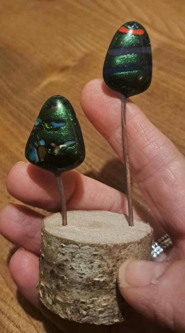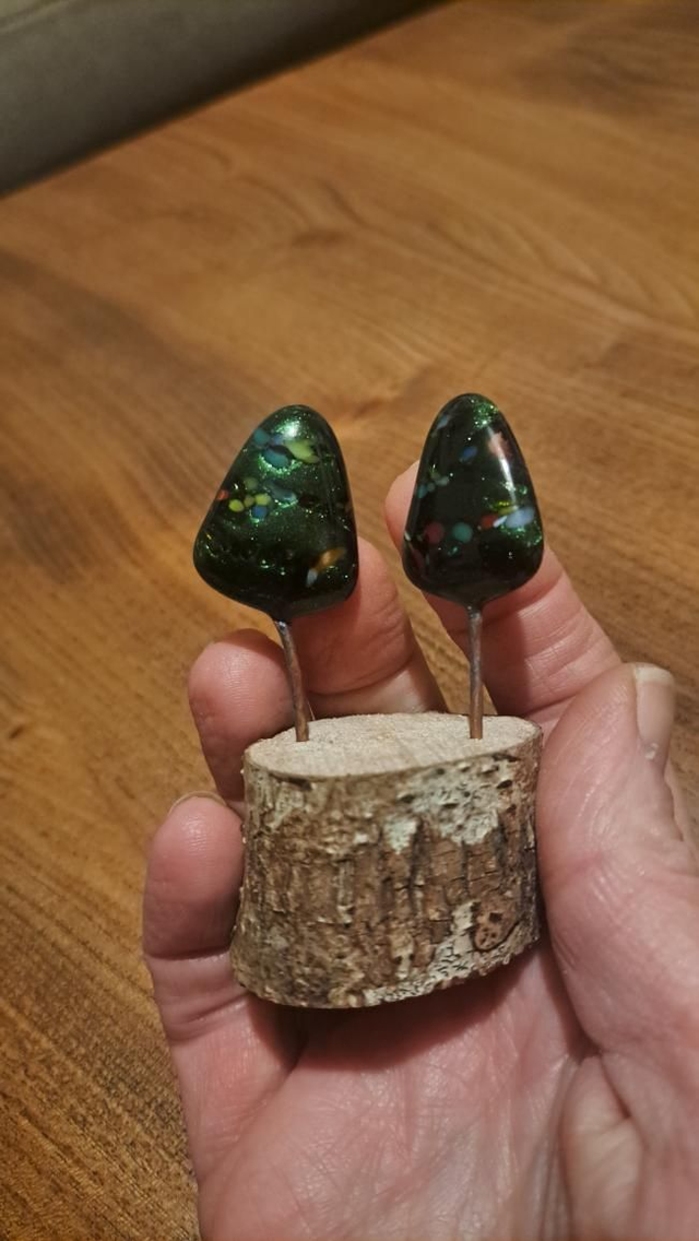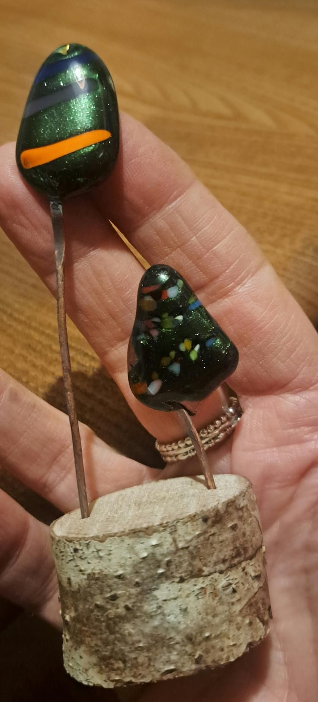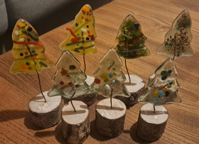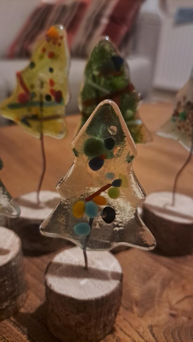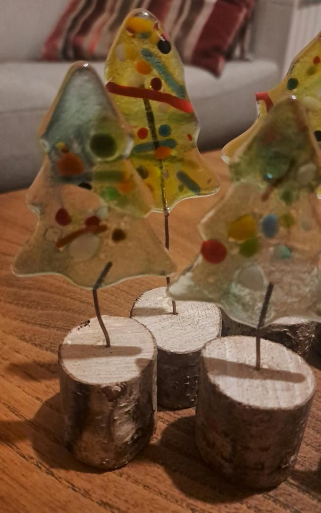 Fused-glass Christmas trees, created using glass powders, murrine, mica glitter, and colourful glass stringers. Fused with copper trunk and placed in a branch stand