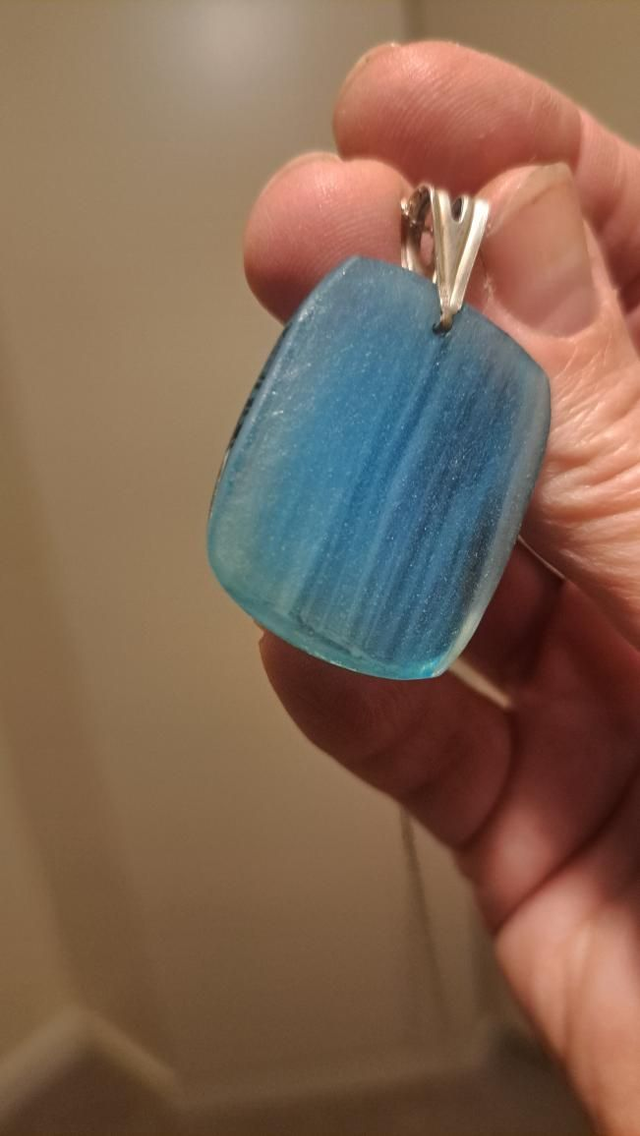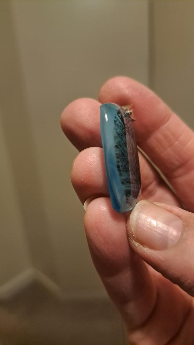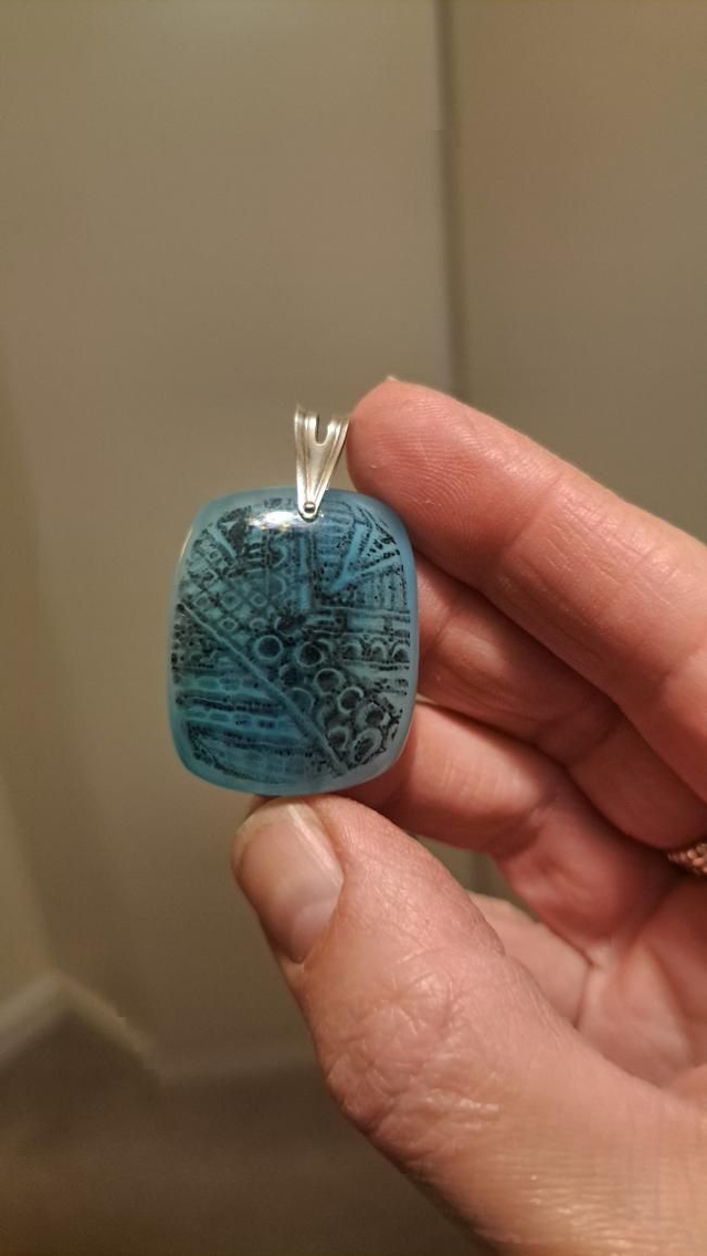 Streaky blue bullseye capped with clear glass with black enamelled pattern, fully fused then drilled and finished with sterling silver findings. Comes in a gift box.