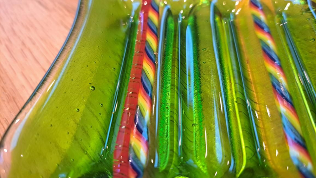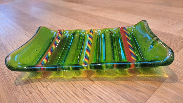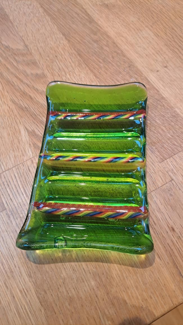 Oblong fused glass soap dish, created using translucent green glass with rainbow inspired murrine cane strips. Fully fused in my kiln then slumped into a soap dish mold, measures 13.5 x 9 x 1cm