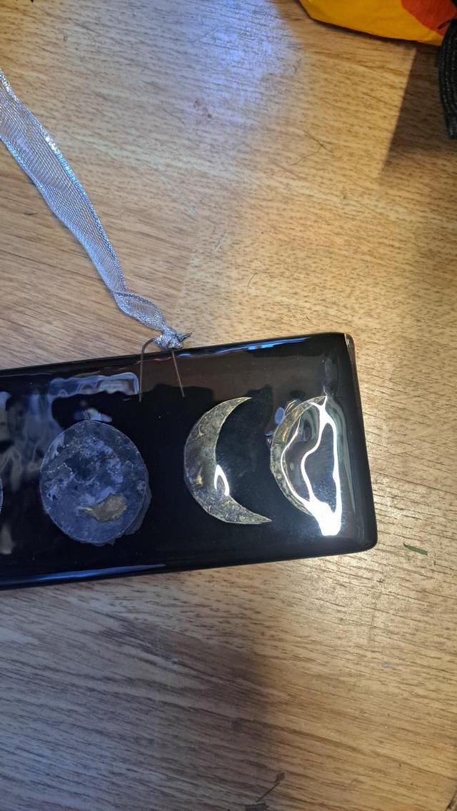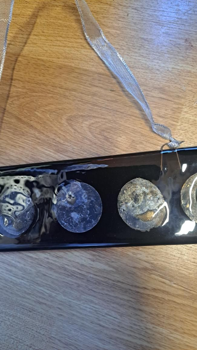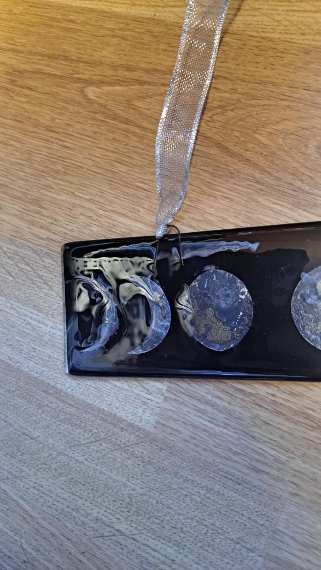 Capped in a clear sheet of tekta glass with hooks attached and fully fused in my kiln. Then some silver ribbon (obviously!) was attached, all ready to hang.