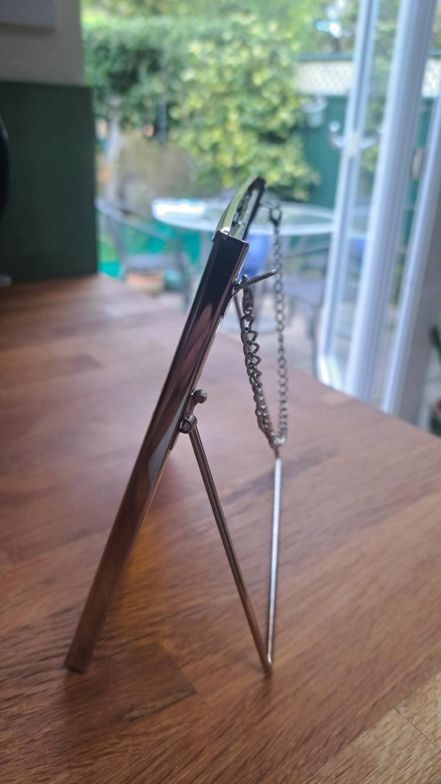 Set in chrome metal, versatile stand, which has a chain to hang or a stand. Perfect for a windowsill or sunny window. The piece measures 16.5 x 16.5 cm.