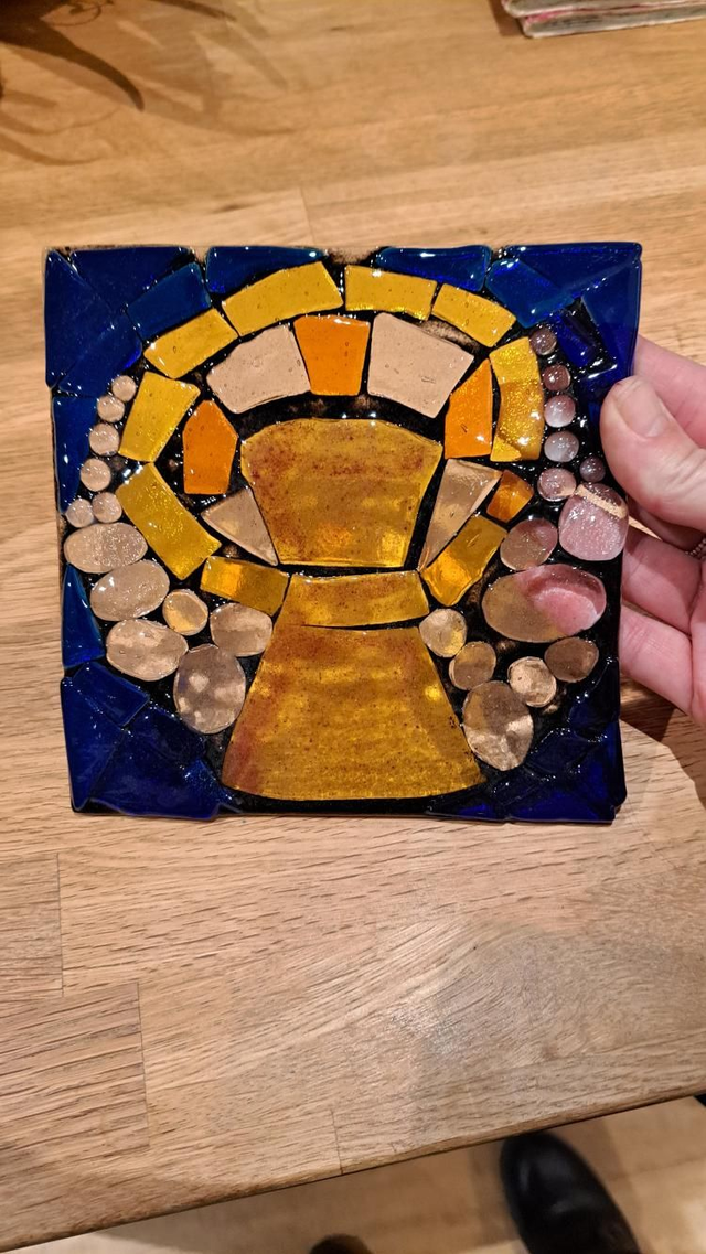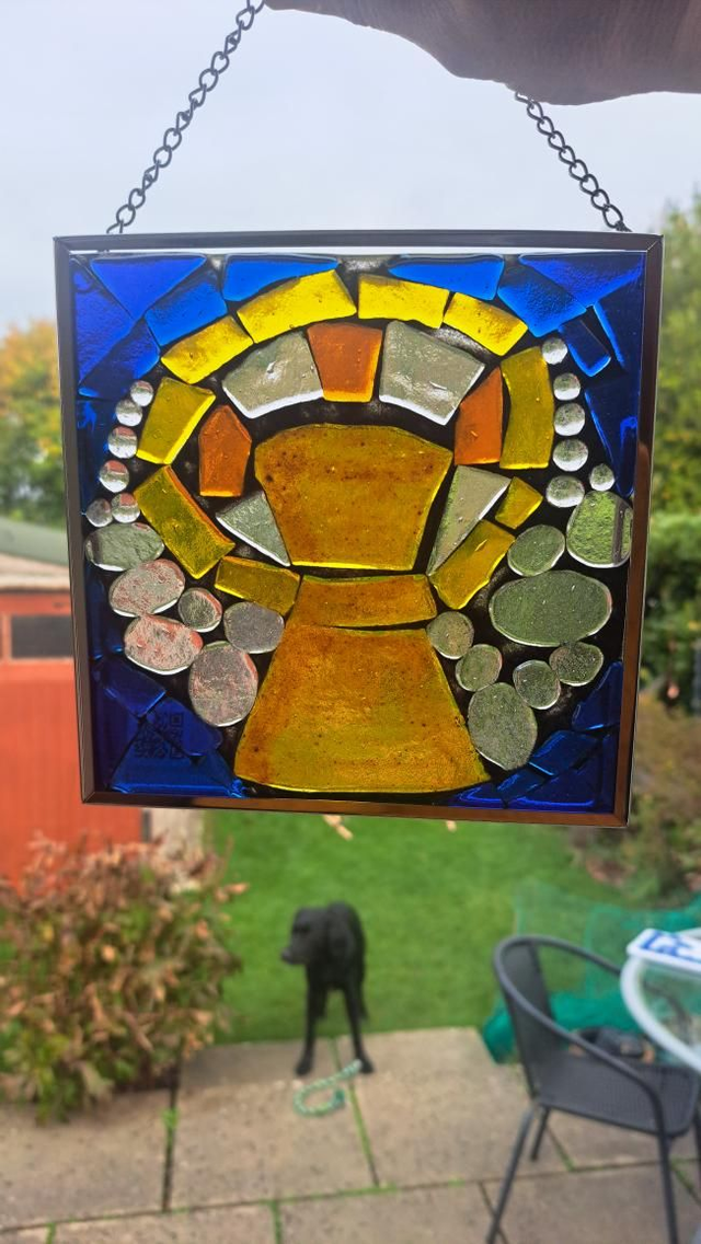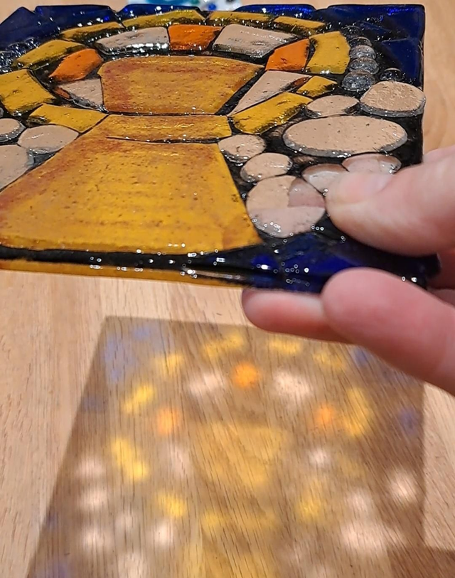 The glass has been hand cut and placed on a sheet of clear tekta glass. The leaded effect was created using black bullseye glass powders. The piece was tack fused and set in the frame.