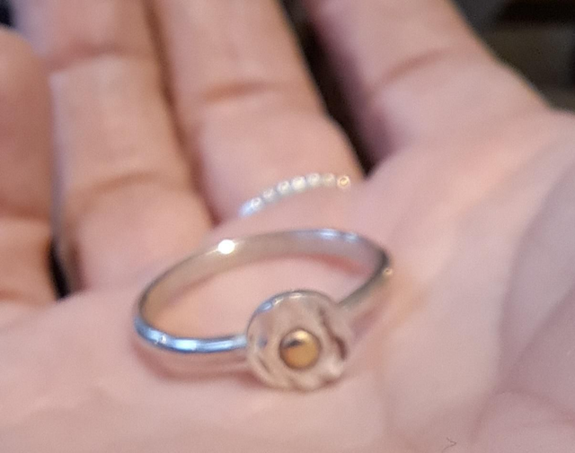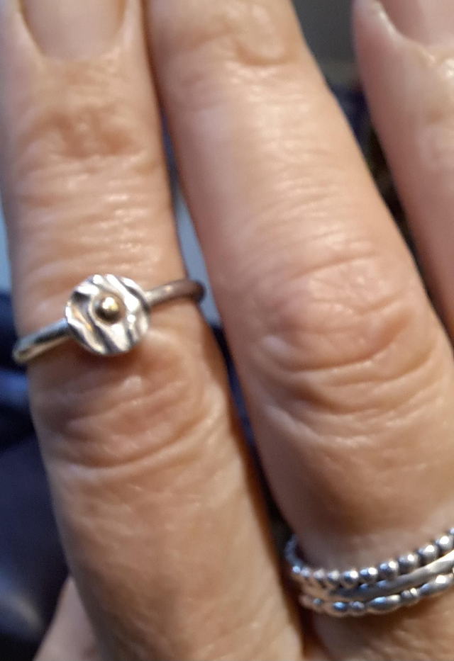 Unique silver ring made using traditional silversmithing techniques. Additional circular silver motif soldered, with a 9 carat nugget of gold. Machine polished. Hallmarked with my sponsor mark from Birmingham Assay Office.
