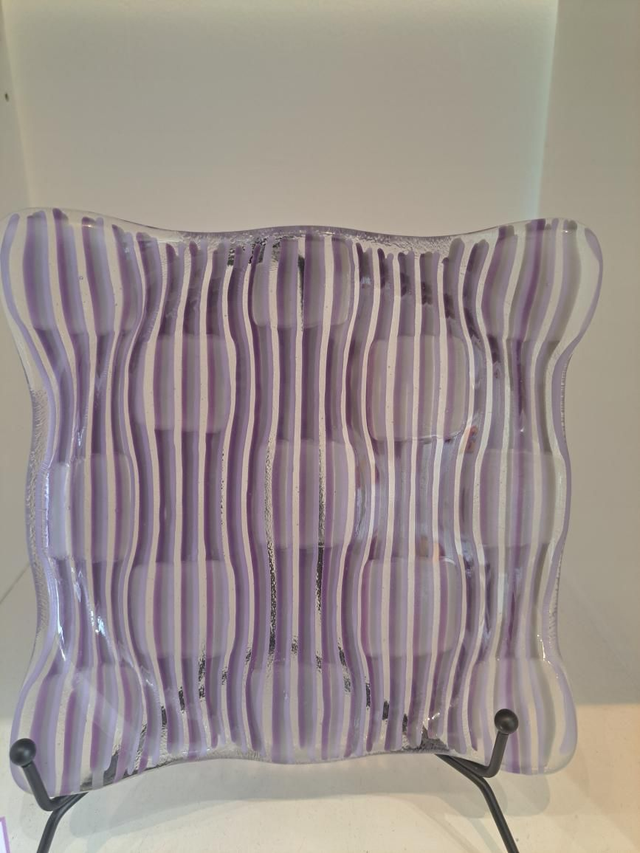 A purple themed dish created using glass stringers fully fused to a 20 x 20cm square sheet of tekta glass. Then squares of clear tekta glass placed in a chess board pattern and fused on the top. Finally, the piece was slumped in its 3rd firing into a dish shape. Finished on a black stand.