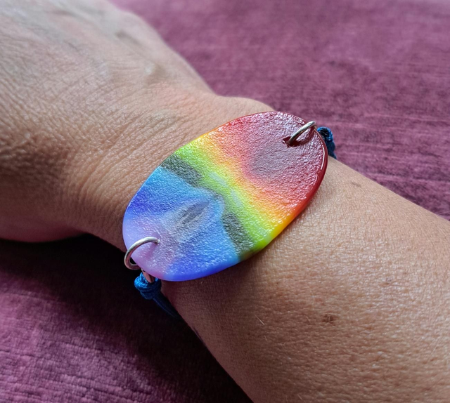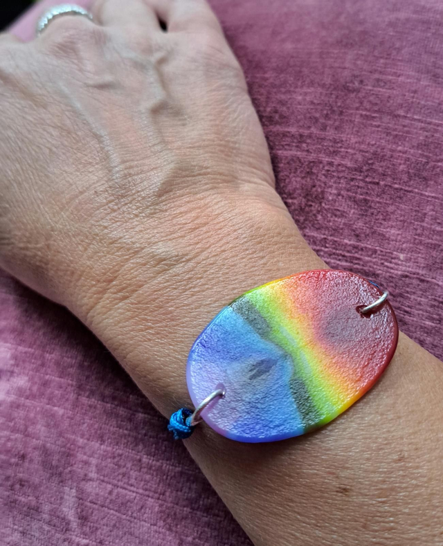 Unique oval fused-glass rainbow coloured bracelet with blue adjustable wrist cord. Comes in a gift box.