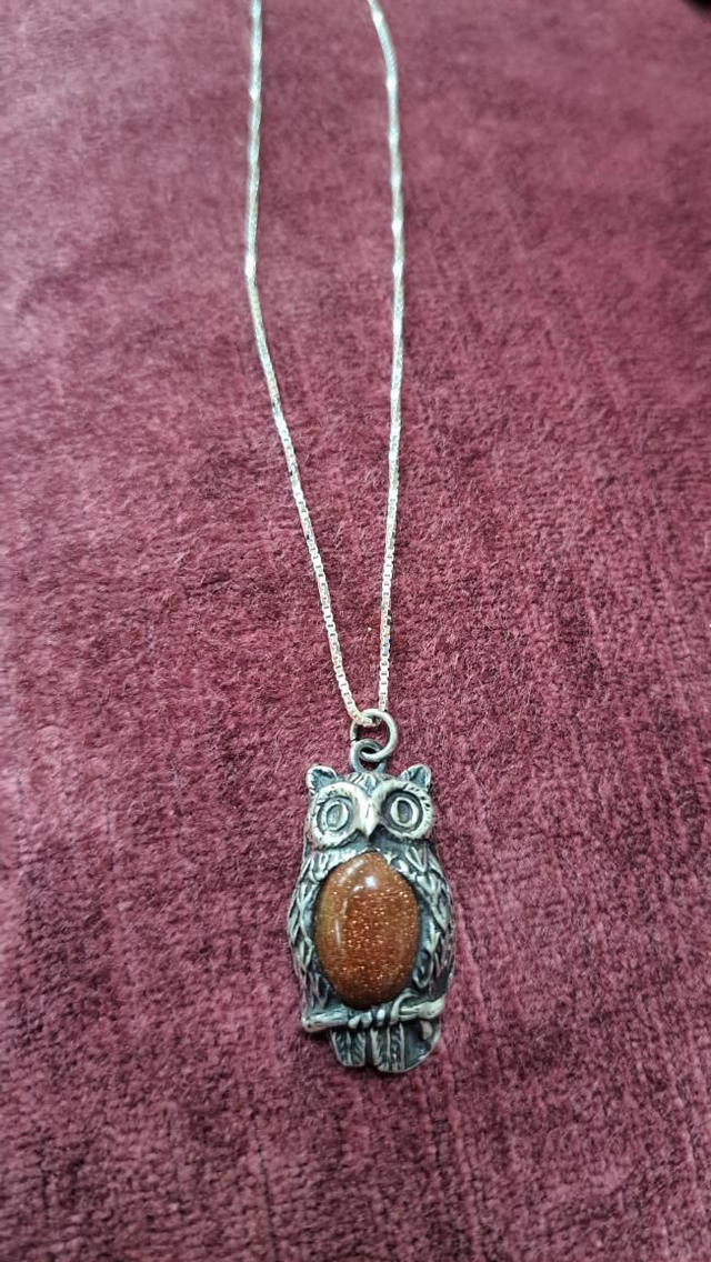 Sterling silver pendant created using an owl mold with an oval gold stone cabachon inset in the design. Kiln fired, dipoed in liver of sulphur for definition and machine polished. Finished on a sterling silver findings and an 18" chain. Comes in a gift box.